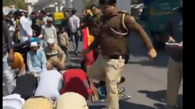 ভিডিওটিতে দেখা যাচ্ছে, রাস্তায় অনেকে একসঙ্গে নামাজ পড়ছিলেন। তারা যখন সিজদা করছেন, তখনই এক পুলিশ কর্মী নামাজিদের লাথি মেরে সরিয়ে দেওয়ার চেষ্টা করছেন।