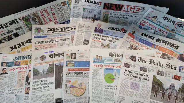 কোটা সংস্কার করে সেটি ৫৬ শতাংশ থেকে সাত শতাংশে নামিয়ে আনার ব্যাপারে সুপ্রিম কোর্টের আদেশ সংক্রান্ত খবর সব গণমাধ্যমের প্রধান শিরোনামে উঠে এসেছে। এক্ষেত্রে পত্রিকাগুলোর প্রথম পাতার নির্বাচিত কিছু খবর তুলে ধরা হল।
