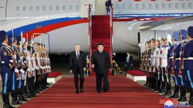 রাশিয়ার প্রেসিডেন্ট ভ্লাদিমির পুতিন উত্তর কোরিয়ার রাজধানী পিয়ংইয়ং-এ পৌঁছেছেন এবং বিমানবন্দরের টারমাকের লাল গালিচায় তাকে স্বাগত জানিয়েছেন উত্তর কোরিয়ার প্রেসিডেন্ট কিম জং আন।