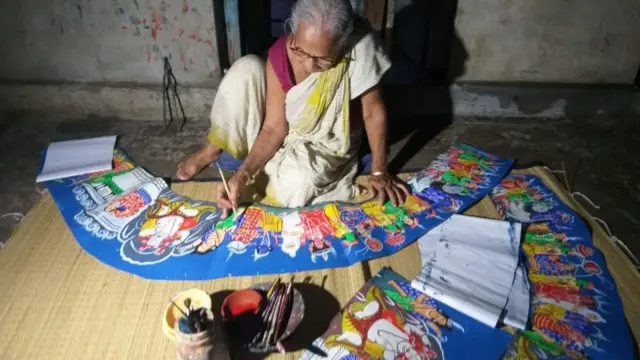 "পঞ্চান্ন বছর ধরে পট আঁকছি। স্বামীর হেল্পার হিসাবে কাজ শুরু করেছিলাম।"