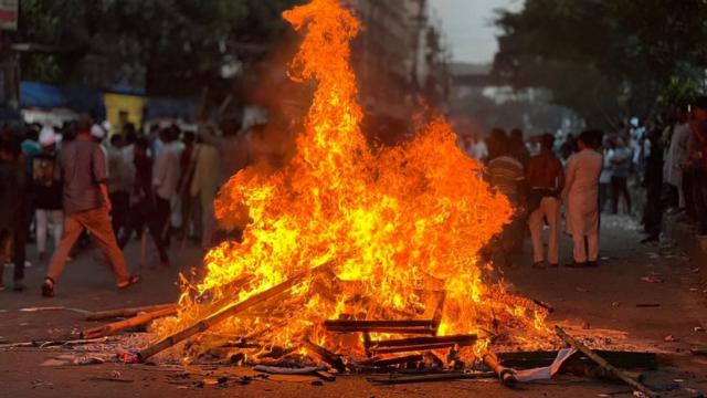 ছবির ক্যাপশান, সংঘর্ষের এক পর্যায়ে সড়কে নানা জিনিসপত্রে আগুন ধরিয়ে দেয় বিক্ষোভকারীরা