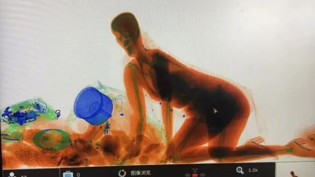 দক্ষিণ চীনের ডনগুয়ান রেল স্টেশনের সিকিউরিটি ভিডিতে দেখা যাচ্ছে, একজন নিরাপত্তা রক্ষী ঐ নারীকে বলছেন ঐ সিকিউরিটি মেশিনের মধ্য দিয়ে সব কিছু পরীক্ষা করাতে হবে।