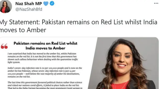 উত্তর ইংল্যান্ডের ব্রাডফোর্ড শহরের পাকিস্তানি বংশোদ্ভূত এমপি নাজ শাহ সরকারের সিদ্ধান্তে “বিস্ময়“ প্রকাশ করে বলেন, কোয়ারেন্টিনের জন্য ট্রাফিক লাইট পদ্ধতির ব্যবস্থাপনায় ব্রিটেন আবারও “আহাম্মকি আচরণ“ করলো।