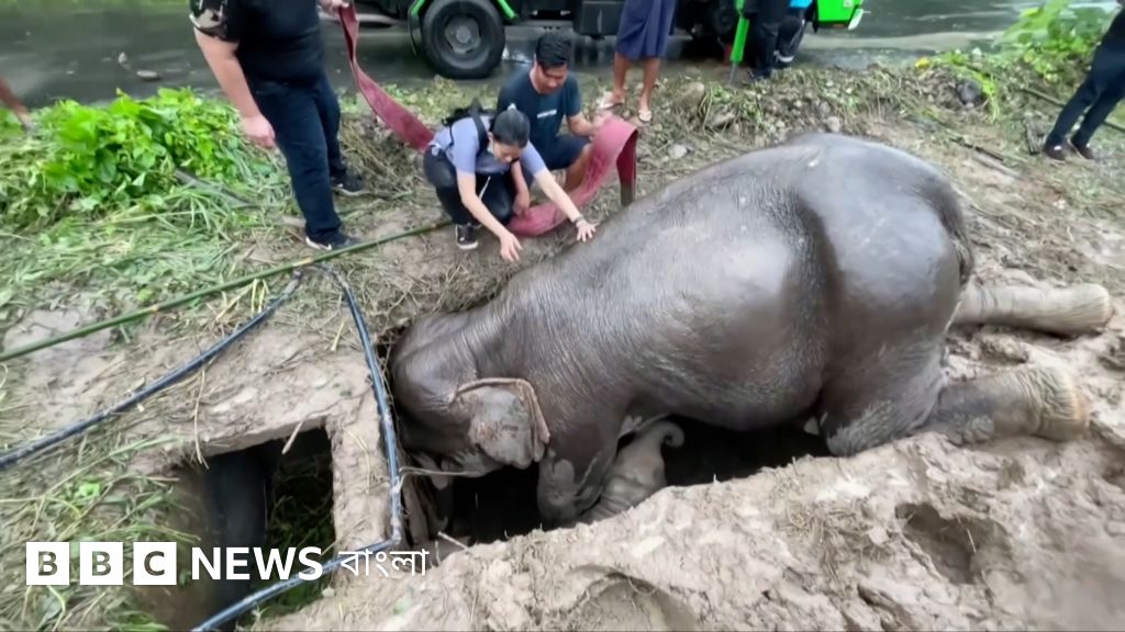 থাইল্যান্ডে গর্তে পড়ে যাওয়া একটি হাতি ও তার বাচ্চাকে বাঁচিয়েছেন উদ্ধারকর্মীরা।