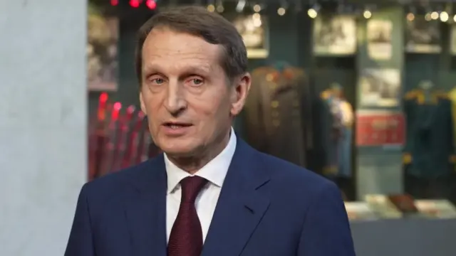রাশিয়ার সামরিক যাদুঘরে এক অস্ত্র প্রদর্শনীর উদ্বোধনী অনুষ্ঠানের সময় রুশ গুপ্তচর প্রধান সের্গেই নারিশকিনের সঙ্গে কথা বলেন বিবিসির সংবাদদাতা স্টিভ রেজেনবার্গ।