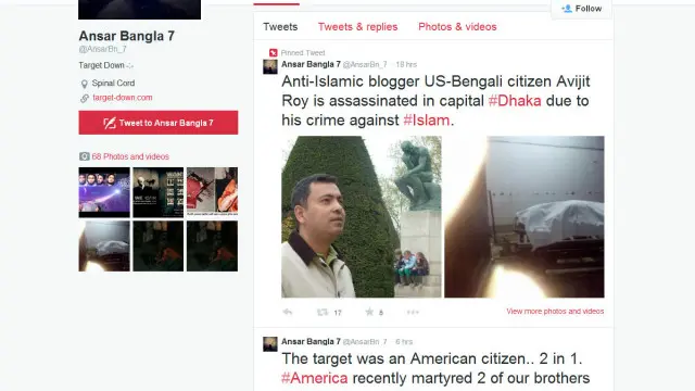 আনসার বাংলা সেভেনের একাউন্ট থেকে পর পর বেশ কয়েকটি টুইট করা হয় অভিজিৎ রায় নিহত হওয়ার কয়েক ঘন্টা পর।