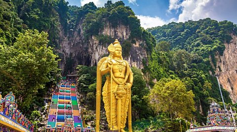 A huge golden statue of Lord Murugan, at 43 metres high, welcomes visitors to climb the 272 colourful steps at the entrance to the caves. There are four large cavern systems with around 20 inter-connected chambers. The largest, the Cathedral Cave, has natural openings that let light through, illuminating the numerous shrines. These feature bright and intricate murals and carvings depicting scenes from Hindu legends. The Batu Caves are open to visitors and are the focal point for the annual Tamil Hindu festival of Thaipusam in Malaysia.