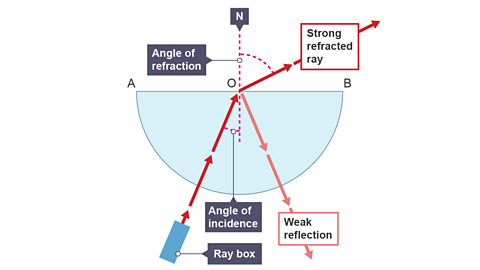Image caption, 3. Increase the angle of incidence so that the angle of incidence at O should be about 15°. Observe the refracted ray – away from the normal into air. Note that there is also a weak reflected ray inside the glass block.