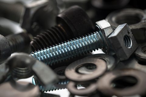 Nut and bolts are a metal fastening device used to join two pieces of material together through aligned drill holes in both bits of material. The bolt fits through the holes and the nuts holds it in place. The benefit of nuts and bolts is that they can be easily removed.