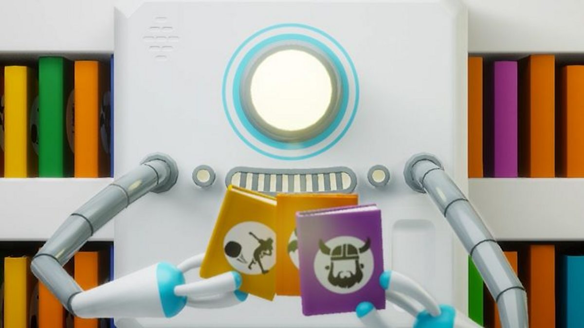 The kids are on a spaceship far, far away. They are feeling a bit bored and so decide to go to the library. Here they meet the ‘robrarian’ – the robot librarian. He asks them what sort of book they want.