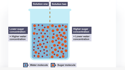 Water moves down the concentration gradientThe difference in concentration between two solutions, between different cells or between cells and a surrounding solution. without needing energy.
