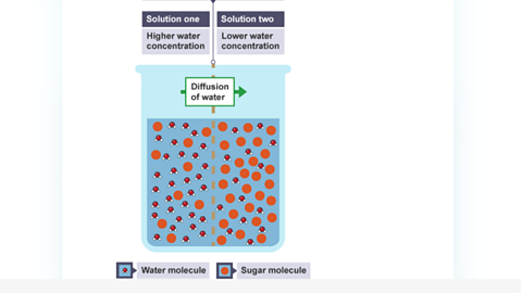 Osmosis is the diffusionThe random movement of a substance from a region of high concentration to a region of low concentration. of water molecules from a dilute solution (high concentration of water) to a more concentrated solution (low concentration of water) across a selectively selectively permeableThe property of a membrane that controls the movement of molecules depending on their size..