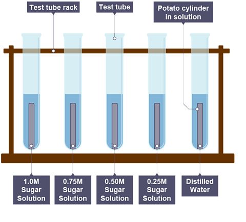 The potato cylinders placed in pure water (0.0M) or weak sugar solutions will gain mass as water will have moved from an area of high concentration (outside the potato cells) to an area of lower concentration (inside the potato cells).