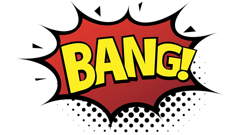 Sound effects really help make a comic fun! Shapes like these with big letters work well when you use a word that sounds like the noise it describes, like bang, boom, whack. This is called onomatopoeia.