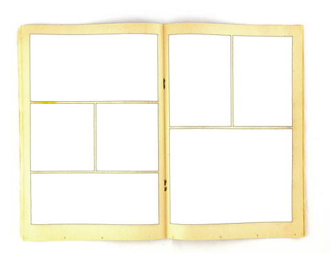 In a comic book, each little moment in the story fills a space on the page. These are called panelA box or frame that contains a moment or scene in a comic. . In this picture you can see blank panels all ready to be filled with drawings, to make a new comic story.
