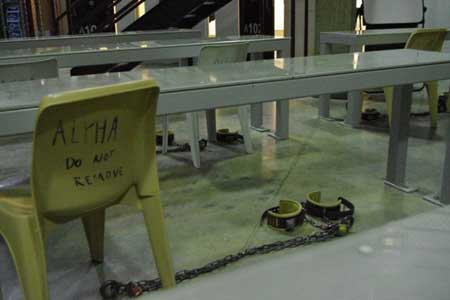 They were sitting at hexagonal metal picnic tables in a dimly lit circular area surrounded by their single cells; a balcony ran all the way around the second floor off which there were more cells. Seven detainees, some with beards, were sitting cross legged on the floor around food which had been laid out. We couldn't hear anything and they had no idea we were observing them. It felt like we were watching a silent movie and if it hadn't been for the security paraphernalia and guards stationed at various points around the perimeter - it looked like a group of friends socialising. We weren't allowed to interview the detainees because it would break the Geneva Convention (exposing prisoners to extreme curiosity), so why isn't observing them breaking the Convention? "It's about us being transparent Ma'am". But it isn't it voyeuristic? "It's about us being transparent Ma'am", came the repeated response.