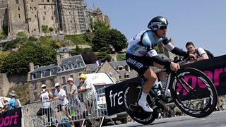 Frenchman Sandy Casar was spectacularly felled by a wayward dog whilst in a breakaway. He remounted to go on and win the stage. Watch on Youtube