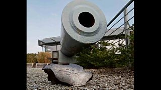 Photo by BBC reporter Jonathan Swingler of Hartlepool shell fragment next to Seydlitz gun barrell in Germany