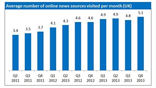 Alongside the business benefits, there is growing choice for UK audiences. New analysis contained in the report shows UK audiences on average use five different online news sources, up a third in the past two years (see figure 2). They turn to different sources for different reasons, getting more entertainment and interaction with social media, more in-depth coverage and expertise thanks to newspaper sites, and the most trusted and accurate news from broadcasters.