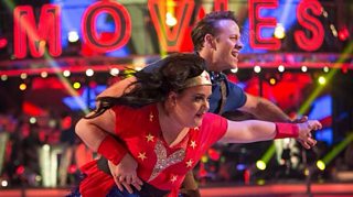 Susan Calman as Wonder Woman on "Some dancing show" (Strictly Come Dancing)