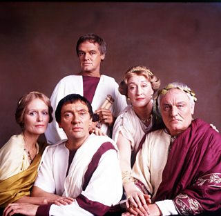 Julius Caesar - Virginia McKenna as Portia, Richard Pasco as Marcus Brutus, Keith Michell (stood in background) as Marcus Antonius (Marc Antony), Elizabeth Spriggs as Calpurnia and Charles Gray as Julius Caesar (1979)