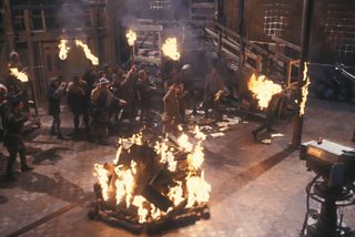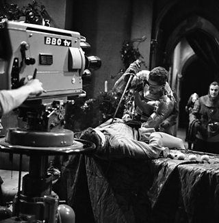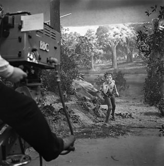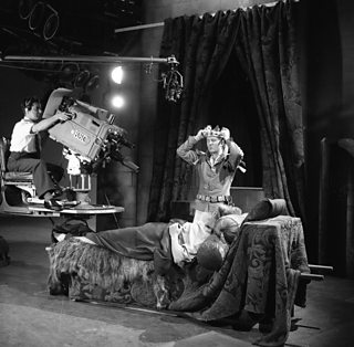 The Tempest - David Dixon as Ariel and Michael Horden as Prospero with film crew on set at Television Centre (1980)