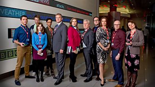 The cast of W1A pictured in the foyer of New Broadcasting House