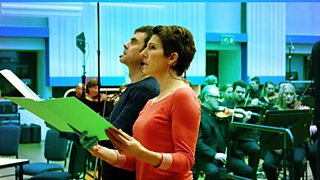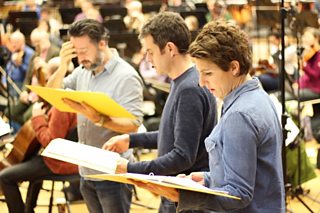 Richard Harrington, Paul Higgins and Tamsin Greig rehearse with BBC Philharmonic Orchestra