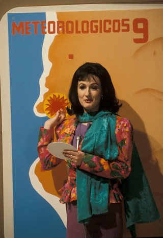 Caroline playing the part of Paola Fish, Channel 9's weather presenter, one of many popular sketches in the Fast Show.