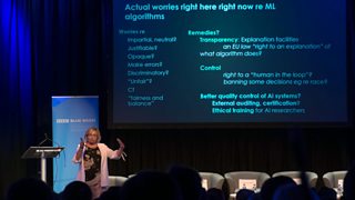 Visions of an emerging AI utopia were laid to rest by two other speakers. Lilian Edwards, professor of e-governance at the University of Strathclyde, talked about the need to understand the ‘inputs’ to AI systems in order to know whether their outputs are fair and unbiased. What data has a machine learning system been ‘trained’ on? Because systems can have a “historic bias embedded in them”.