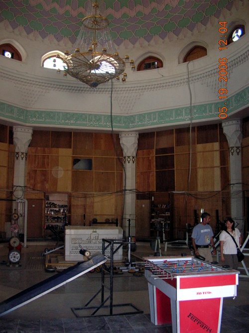 The Iraqi Baaths hated the Syrian Baaths and they embraced the exiled Aflaq. After he died they built a grand mausoleum for him in Bagdhad. Here is a photo of what had happened to the mausoleum by 2006. It had been turned into a gym for the invading American troops. You can see Aflaq's tomb behind the weights and the table football.