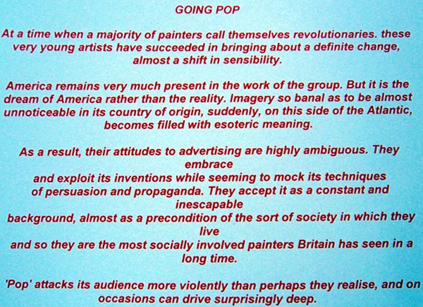 Here are two sections about them. First is Boshier - he brilliantly describes how popular images of American power seduce the mind - they start to "infiltrate you at the breakfast table". But one shouldn't be frightened because it is possible to possess those images in turn.