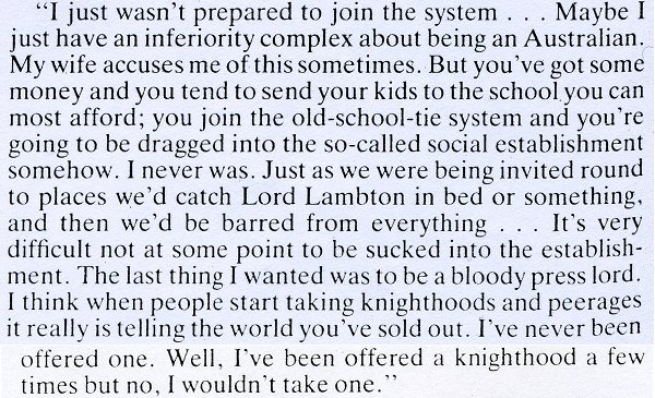Although, as the consummate newsman, Murdoch turns it round and portrays it as him rejecting them. And you can see his guiding myth beginning to take shape here - the revolutionary outsider against the decadent British system.