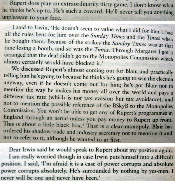 He was the journalist Woodrow Wyatt. Wyatt had been very close to Mrs Thatcher throughout the 1980s and he had become what he proudly called "Rupert's Fixer". But secretly Wyatt was writing a diary every day recording not just his life within the establishment but also his day to day dealings with Rupert Murdoch.