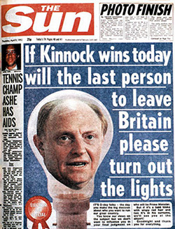 And the Sun launched a massive campaign against Labour. Ending on the day before polling with a famous cover. While inside on page three there was an overweight old woman in a swimsuit with the caption - "Here's what Page Three will look like under Labour"