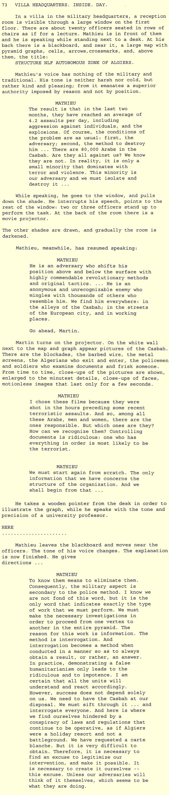 This is the scene in the script of the film where he elegantly and rationally argues the case for this logic of Counterinsurgency.