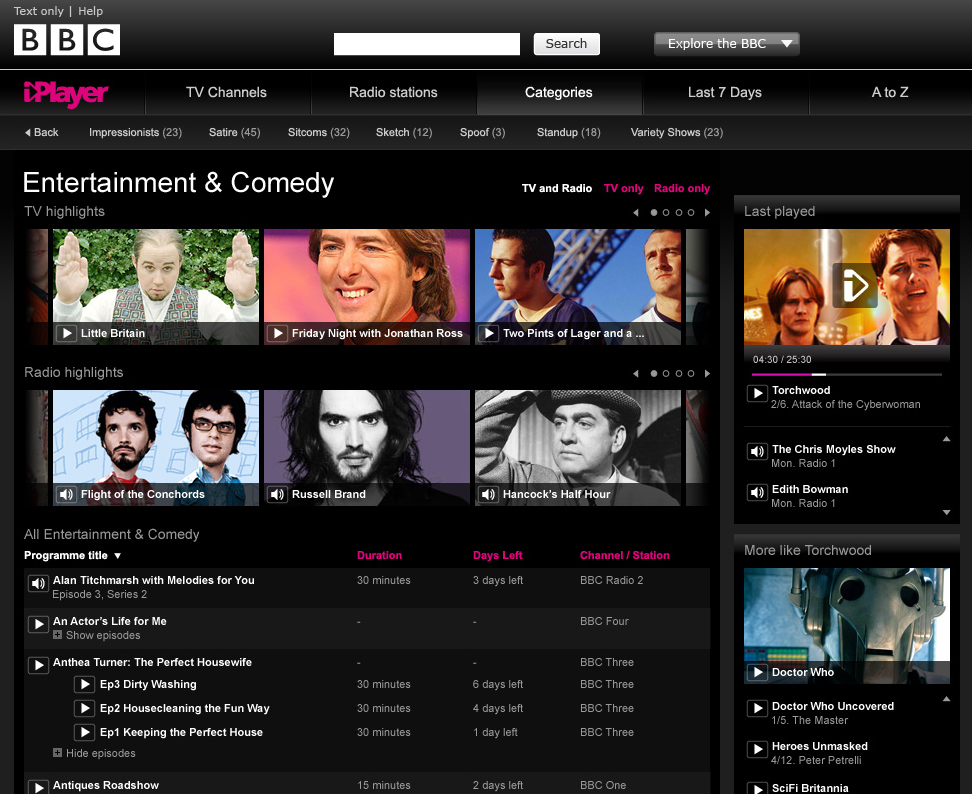 The most important change is that we combined TV and Radio in the same iPlayer interface, which means that you when you go to, say, Comedy, you'll find your favourite TV and radio comedy programmes all in the same page, like this: