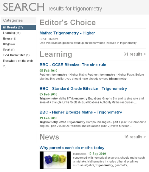 And a search for [trigonometry] will put Learning content at the top.