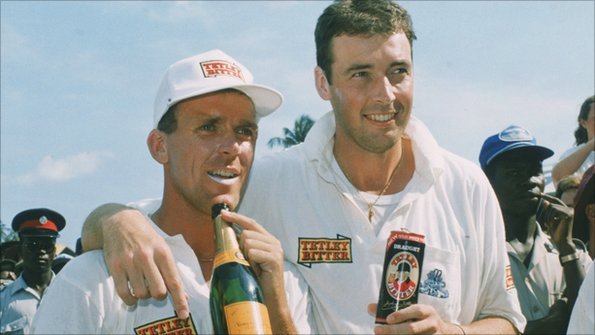 Stewart and Fraser toast an historic England win in Barbados in 1994 (Photo: Getty)