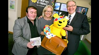 Satchel winner Robert Nesbitt, BBC’s Wendy Austin, who received the donation on behalf of Children in Need, and Terry Fuller, Commercial Products Manager for USEL