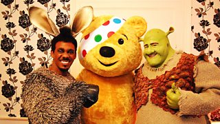 Pudsey with Donkey and Shrek from Shrek: The Musical