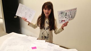 “I am twelve years old. I go to school in Hertfordshire. I enjoy playing tennis and cooking, and I have an older brother and sister and a sausage dog called Chester. My big idea is to make a book about what makes people happy! I am asking lots of interesting and famous people to write or draw what makes them happy. I will then put them all in a book that people can buy. All the money from sales of this book will be donated to BBC Children in Need. So far I have got over 30 responses from celebrities!