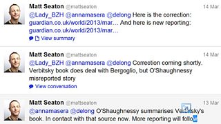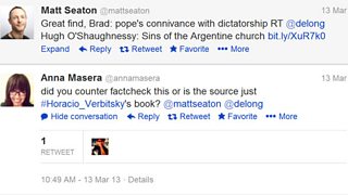 But something was wrong with the findings, like those tweeted here: “Great find, Brad: pope's connivance with dictatorship RT Hugh O'Shaughnessy: Sins of the Argentine church http://bit.ly/XuR7k0.”