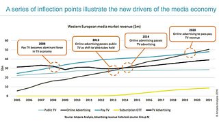 To answer his own question, he outlined trends which have seen traditional TV advertising decline as a percentage of GDP in Western Europe. Around 2008, subscription TV income overtook TV advertising, and there are no signs that commercial TV will catch up again. Meanwhile public television, including the BBC, remains the poor relation with less revenue than either subscription (pay) TV or TV advertising.