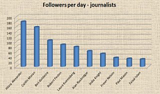 There are plenty of possible objections to drawing conclusions from these figures - that celebs acquire Followers by name recognition alone, for instance. But, when a journalist is being paid to put time into tweeting, a crude measure of how efficiently he or she is building an audience must be of interest. Even for celebs, whose audience may be more easily acquired, this measure still indicates whether tweets are welcome: Unfollow is always only a click away.