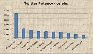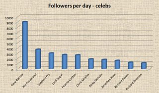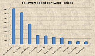 Richard Branson - Britain's top tweeter according to The Independent - comes only sixth of these ten in terms of number of Followers. But because he has tweeted relatively little (just over 1,000 tweets compared to Jonathan Ross' 17,000), in terms of building his audience his tweeting is much, much more efficient than for those at the bottom of this chart.