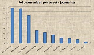 But even at the bottom of this list, where Richard Bacon is getting 98 Followers every time he tweets, that's much more than anyone on my journalist list. Top here (below) are Alan Rusbridger and Robert Peston, with around 34 new Followers for every tweet.