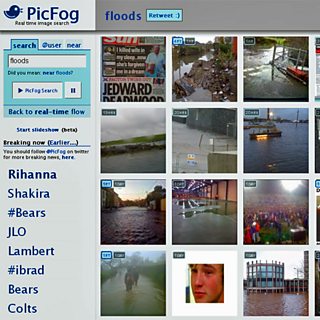 Picfog is a clever tool for realtime searching of pictures on Twitter. It's a great way to get an instant view of what kind of images are being uploaded, since it includes a Breaking Now list as well as access to previous popular subjects.