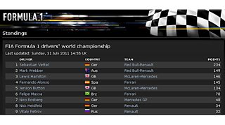 “Hamilton goes into the summer break third in the championship, 88 points behind Vettel, with Alonso one point back in fourth and Button remaining fifth, 100 points adrift.”