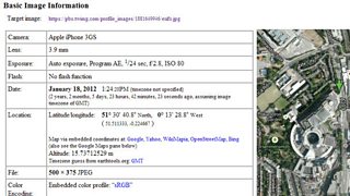 Quite a few add-ons and websites will read the Exif data, but Jeffrey’s is one of my favourites. Installing this (Chrome) add-on will allow you to right-click on an image and send it to Jeffrey’s for analysis. Other Exif readers are available for Firefox.